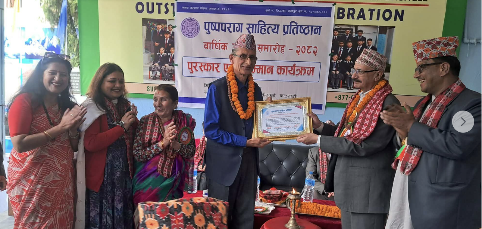 काठमाडौं, २०८२ साल चैत्र २८ गते। लीलाध्वज थापा साहित्य प्रतिष्ठानको आयोजनामा त्रैमासिक रचना वाचन तथा स्रष्टा सम्मान/पुरस्कार प्रदान कार्यक्रम सम्पन्न भयो। उक्त समारोहमा प्रतिष्ठानका अध्यक्ष विजयध्वज थापाले नेपाली साहित्यमा लामो समयदेखि उल्लेखनीय योगदान पुर्याउँदै आउनुभएका महाकाव्यकार माधव वियोगी (माधवप्रसाद घिमिरे) लाई ‘लीलाध्वज थापा स्रष्टा सम्मान तथा नगद रु. १०,००० (दश हजार रुपैयाँ) पुरस्कार’ प्रदान गर्नुभयो। नेपाली […]