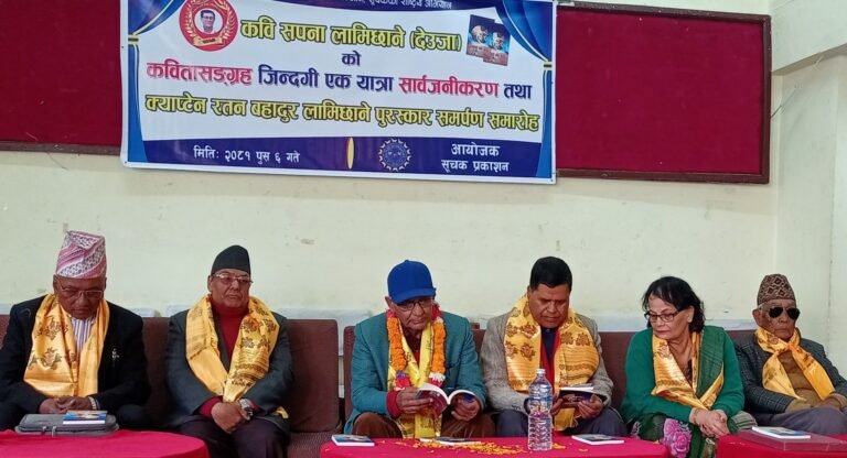 काठमाडौं, पौष ६ गते शनिबार । सूचक प्रकाशनद्वारा नेपाल प्रज्ञा प्रतिष्ठानको लेखनाथ सभाकक्षमा आयोजित कवि सपना लामिछानेको कवितासङ्ग्रह ‘जिन्दगी एक यात्रा’ दोस्रो संस्करण सार्वजनीकरण तथा क्याप्टेन रतन बहादुर लामिछाने पुरस्कार समर्पण समारोह भव्य र सभ्य रूपमा सम्पन्न भएको छ ।