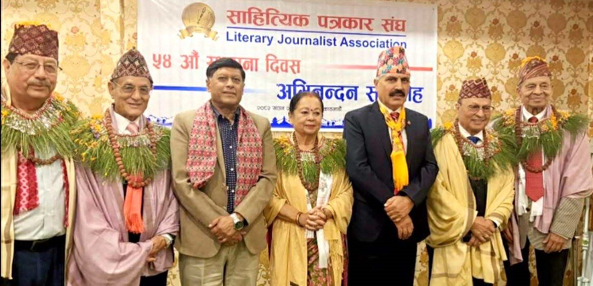 काठमाडौं । साहित्यिक पत्रकार सङ्घको ५४ औं स्थापना दिवसको उपलक्ष्यमा साउन २९ गते आयोजित एक विशेष कार्यक्रममा पाँच जना विशिष्ट सिर्जनकर्मीहरूलाई अभिनन्दन गरियो ।