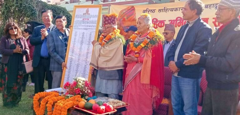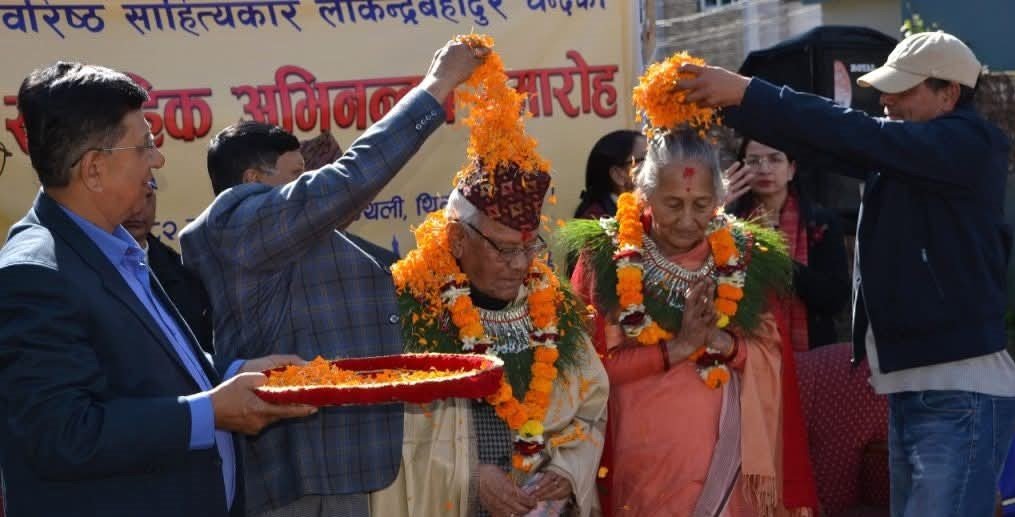 २०८२ मंसिर २३, काठमाडौं । वरिष्ठ साहित्यकार पूर्व प्रधानमन्त्री लोकेन्द्रबहादुर चन्दलाई विभिन्न एकसय एक साहित्यिक संस्थाहरुले भक्तपुर लोकन्थली थिमी चन्द निवासमा सामूहिक अभिनन्दन गरिएको छ ।
