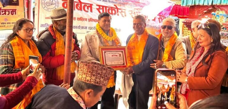 २०८२ माघ ४, काठमाडौं । नोबेल साकोस साहित्य संस्थाले साहित्यिक पत्रकार संघका अध्यक्ष साहित्यकार राधेश्याम लेकालीलाई सम्मान गर्यो । सो सम्मान संस्थाका संस्थापक सदस्य रोहित कार्कीको सभापतित्वमा रत्न पुस्तकालय, मध्य बानेश्वरको प्राङ्गणमा हिजो आयोजित कार्यक्रममा सभापति कार्की, विशिष्ट अतिथिहरू डा. दामोदर पुडासैनी, पुष्प रञ्जित लगायतले दोसल्ला ओढाई सम्मानपत्रसहित सम्मान गर्नुभएको थियो ।