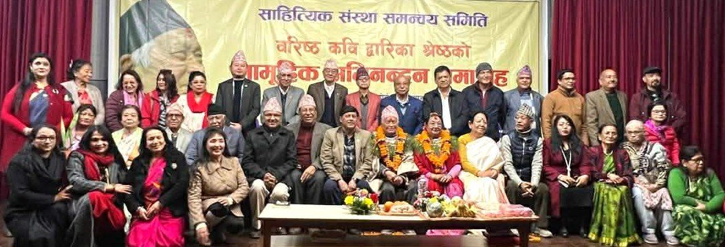 २०८२ फागुन १, काठमाडौं । नेपाली भाषा, साहित्य, कला, संस्कृति र साहित्यिक पत्रकारितामा योगदान गर्दै आएका एकाउन्न संस्थाको साझा मञ्च “साहित्यिक संस्था समन्वय समिति”ले आज नेपाल पर्यटन बोर्ड, भृकुटीमण्डप, काठमाडौंमा ९१ वर्षीय वरिष्ठ कवि द्वारिका श्रेष्ठको सामूहिक अभिनन्दन गरिएको छ ।