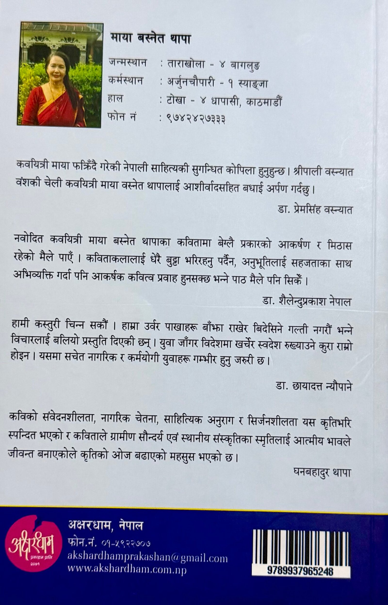 साहित्य समाजलाई सिर्जनात्मक लयमा हिँडाउने भाषिक अभिव्यक्ति हो । सिर्जना असाधारण लेखनकार्य हो । यसलाई प्राज्ञिक लेखन पनि भनिन्छ । यो लेखन मौलिक हुन्छ । प्रत्येक लेखकको भिन्न र विशेष हुन्छ । यस्तो आलङ्कारिक शैलीको सिर्जनात्मक लेखनका कविता, आख्यान, नाटक र निबन्ध गरी मुख्य ४ विधा प्रचलनमा छन् । यीमध्ये कविता बढी लेखिने विधा मानिन्छ । कवि थापाका कविता पनि यिनै विधागत परिचय लिएर आएका छन् । बागलुङ जन्मघर र स्याङ्जाको अर्जुनचौपारीलाई कर्मघर बनाएकी थापा काठमाडौंकी स्थायी बासिन्दा हुन् । उनीसँग लामो समय जापानमा बसेर बिताएको व्यावसायी जीवनको अनुभव पनि छ । गाउँ, सहर र विदेशसम्मको जीवन भोगाइले दिएको अनुभूतिजन्य अभिव्यक्ति उनका कवितामा पाइन्छ । जीवनका यी विविध पाटाहरू लिएर साहित्य सिर्जनामा लागेकी थापाका कविता परिवार, समाज र व्यवसायबाट प्राप्त स्वानुभवी रङले सिँगारिएका छन् ।